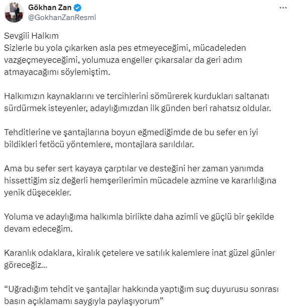 Yoluma ve adaylığıma halkımla birlikte daha azimli ve güçlü bir şekilde devam edeceğim. Karanlık odaklara, kiralık çetelere ve satılık kalemlere inat güzel günler göreceğiz. Uğradığım tehdit ve şantajlar hakkında yaptığım suç duyurusu sonrası basın açıklamamı saygıyla paylaşıyorum”
