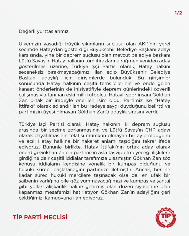 Türkiye İşçi Partisi (TİP), Hatay’da Gökhan Zan’ın adaylığını geri çektiğini duyurduğu açıklamasında şunları kaydetti: “Ülkemizin yaşadığı büyük yıkımların suçlusu olan AKP’nin yerel seçimde Hatay’dan gösterdiği Büyükşehir Belediye Başkanı adayı karşısında, yine bir deprem suçlusu olan mevcut belediye başkanı Lütfü Savaş’ın Hatay halkının tüm itirazlarına rağmen yeniden aday gösterilmesi üzerine, Türkiye İşçi Partisi olarak, Hatay halkını seçeneksiz bırakmayacağımızı ilan edip Büyükşehir Belediye Başkanı adaylığı için girişimlerde bulunduk. Bu girişimler sonucunda Hatay halkının çeşitli temsilcilerinin ve önde gelen kanaat önderlerinin de inisiyatifiyle deprem günlerindeki özverili çalışmasıyla tanınan eski milli futbolcu, Hataylı spor insanı Gökhan Zan ortak bir iradeyle önerilen isim oldu. Partimiz ise “Hatay İttifakı” olarak adlandırılan bu iradeye saygı duyduğunu belirtti ve partimizin üyesi olmayan Gökhan Zan’a adaylık sırasını verdi.