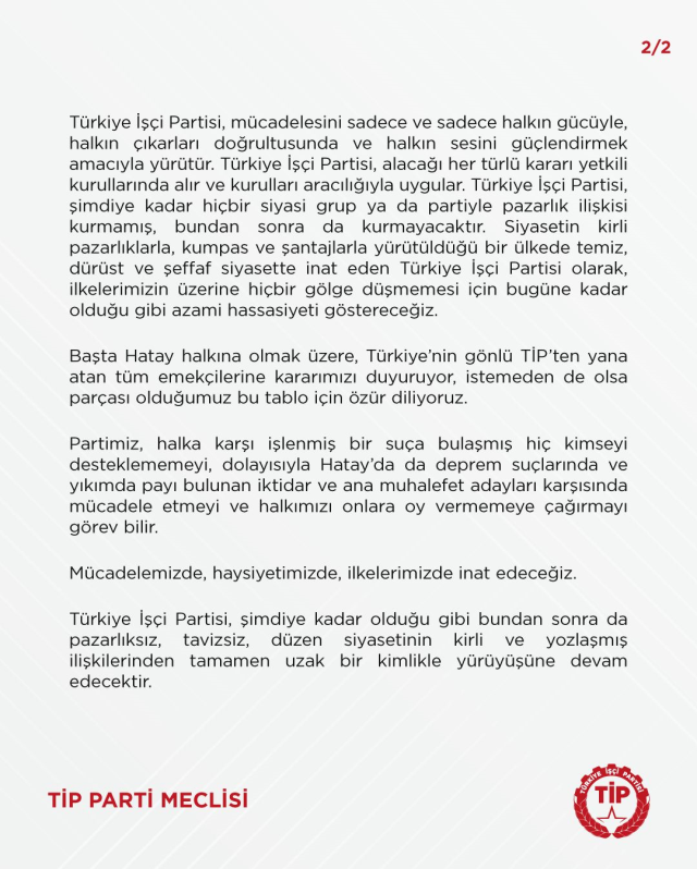 Türkiye İşçi Partisi olarak, Hatay halkının iki deprem suçlusu arasında bir seçime zorlanmasının ve Lütfü Savaş’ın CHP adayı olarak dayatılmasının telafisi mümkün olmayan bir ayıp olduğunu ve acılı Hatay halkına bir hakaret anlamı taşıdığını tekrar ifade ediyoruz. Bununla birlikte, Hatay İttifakı’nın ortak aday olarak önerdiği Gökhan Zan’ın partimizin asla tasvip etmeyeceği ilişkilere girdiğine dair çeşitli iddialar tarafımıza ulaşmıştır.